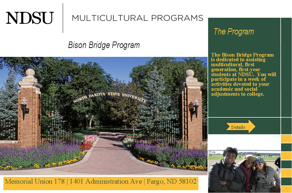 Bison Bridge Program is a new initiative developed by the Division of Equity, Diversity and Global Outreach, with assistance from departments across the university, to assist multicultural, first-generation first-year students at NDSU in realizing a positive start to their college career. Students will participate in a week of activities devoted to their academic and social adjustment to college life. This program is free of charge to the student participants.