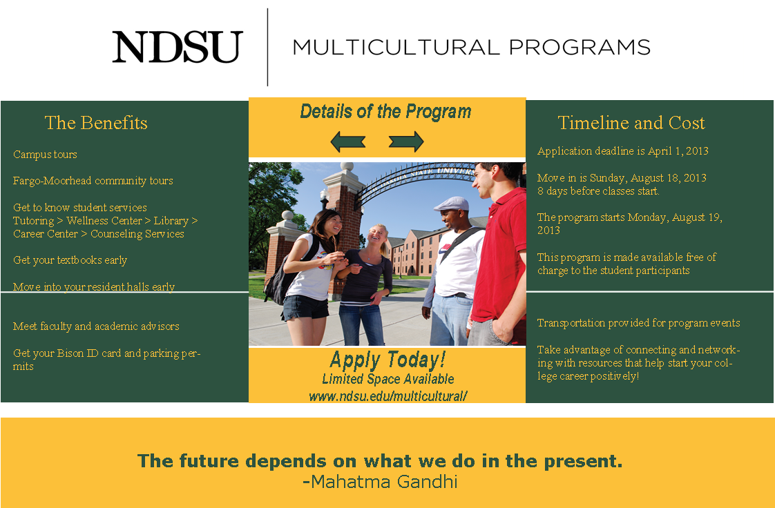 Take advantage of connecting and networking with resources that will start your college career positively! If you are a multicultural, first generation, first-year student enrolled at NDSU for Fall 2013, this program is for you!
