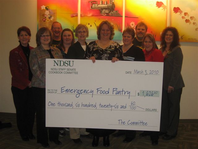 NDSU Staff Senate has made a $1626.60 contribution to the Emergency Food Pantry. the gift was made possible through the sale of cookbooks published by Staff Senate.