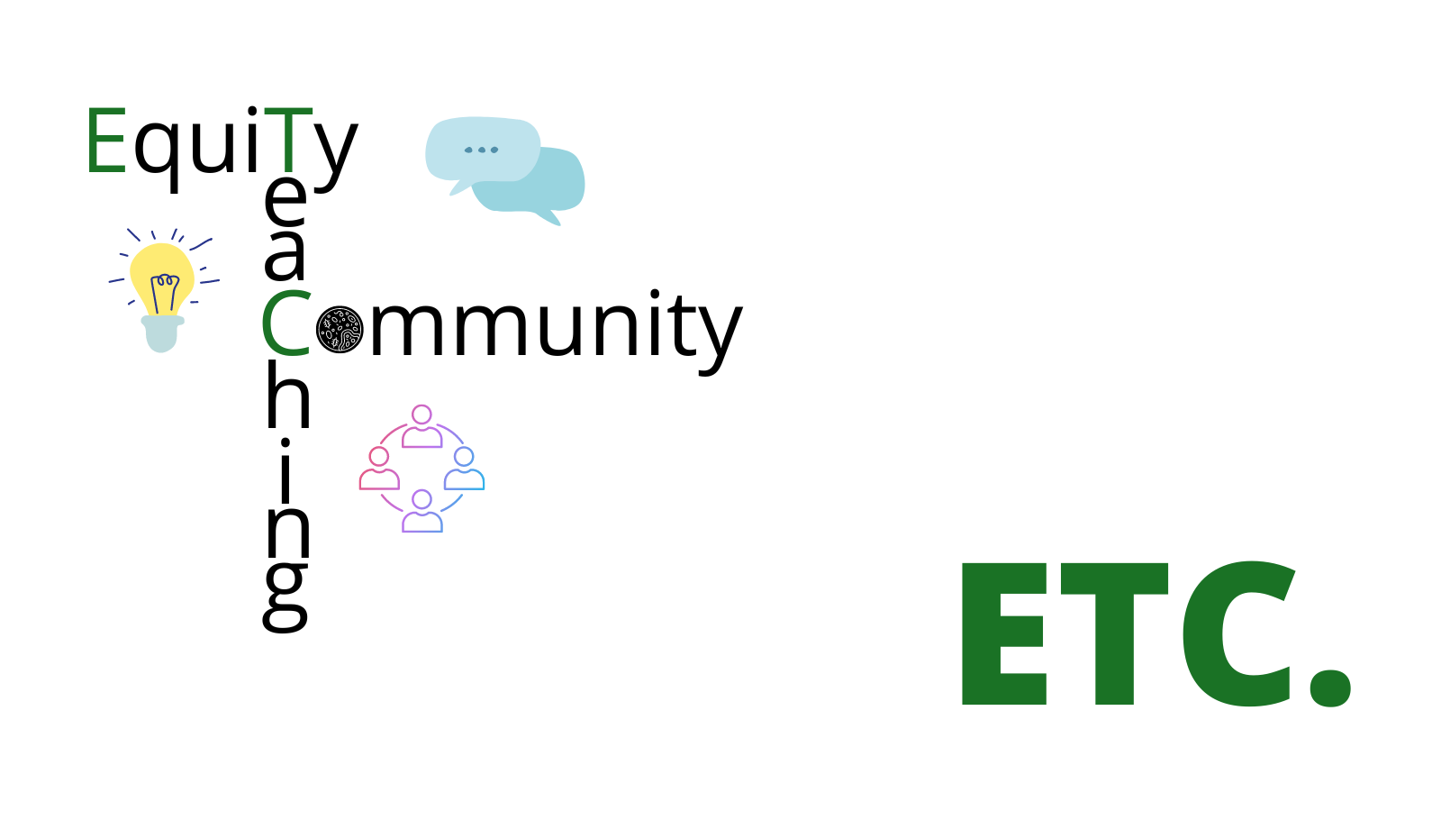 ETC stands for Equity, Teaching, Community - These are the core foci of the Condry research group. We pronounce it Et cetera - which also alludes to the different avenues of educational research we are getting involved in.