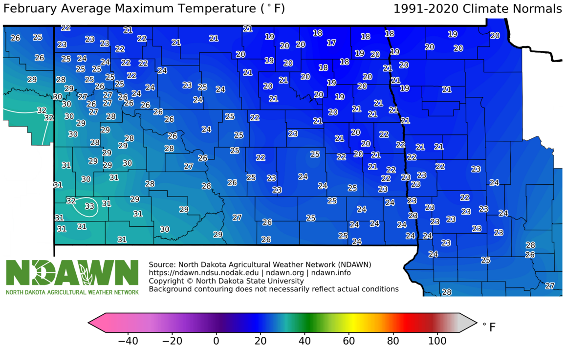 February Average Maximum Temperature (°F) 1991-2020. Source: North Dakota Agricultural Weather Network (NDAWN). © Copyright North Dakota State University. Background contouring does not necessarily reflect actual conditions.
