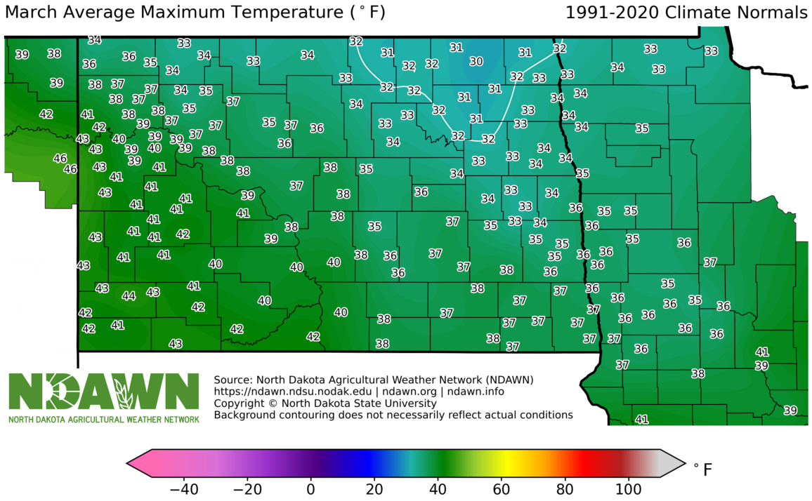 March Average Maximum Temperature (°F) 1991-2020. Source: North Dakota Agricultural Weather Network (NDAWN). © Copyright North Dakota State University. Background contouring does not necessarily reflect actual conditions.