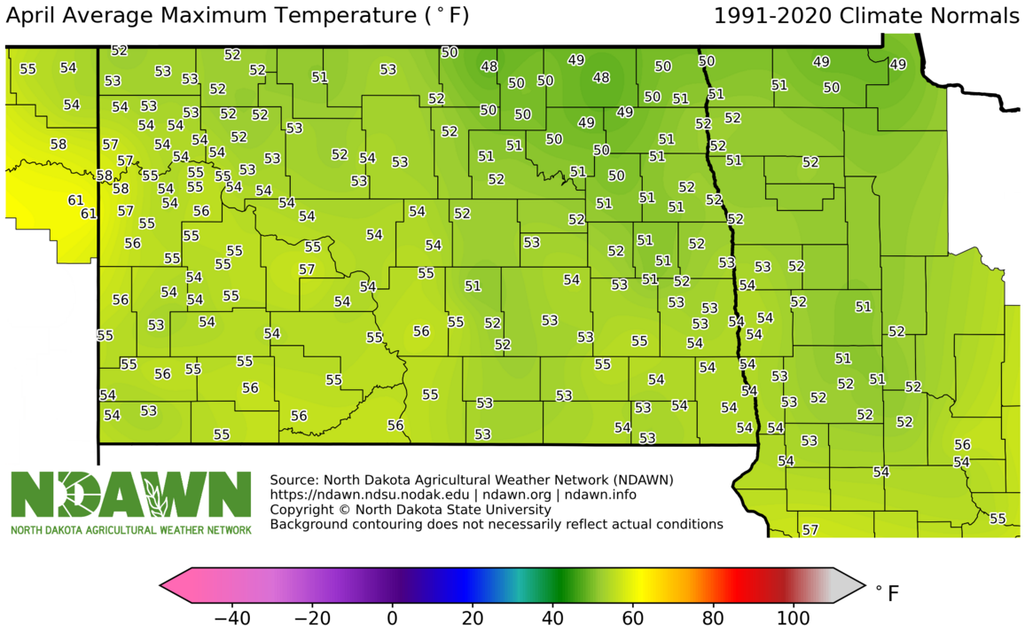April Average Maximum Temperature (°F) 1991-2020. Source: North Dakota Agricultural Weather Network (NDAWN). © Copyright North Dakota State University. Background contouring does not necessarily reflect actual conditions.