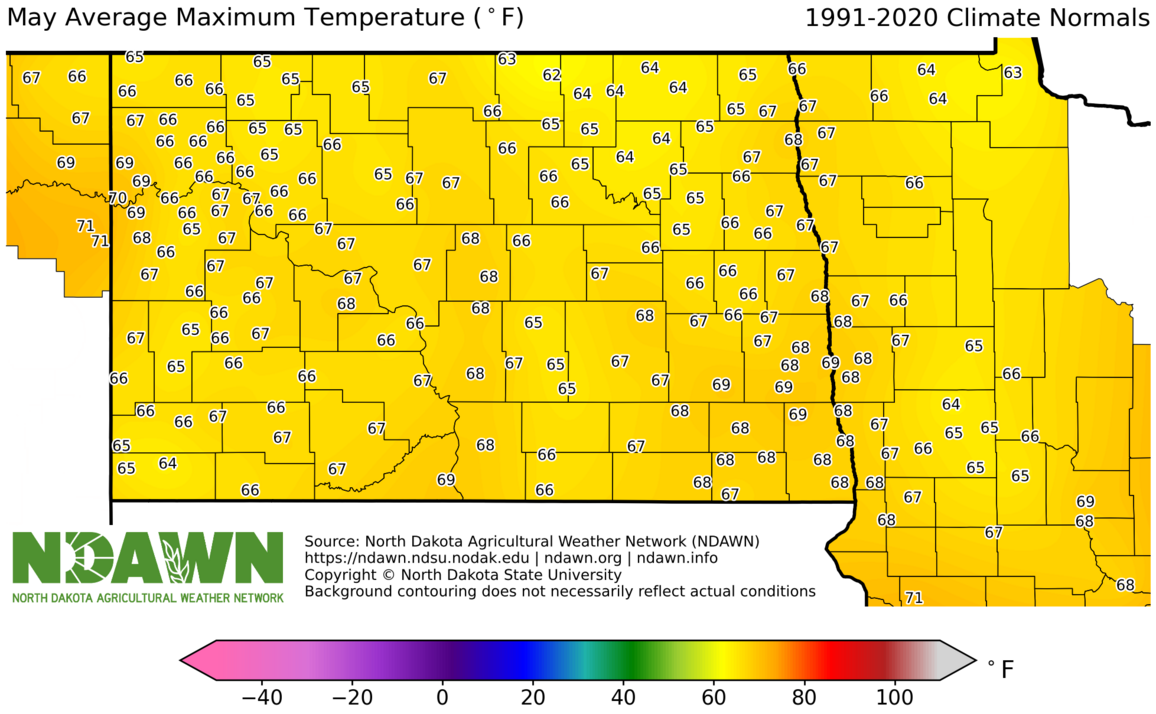 May Average Maximum Temperature (°F) 1991-2020 Source: North Dakota Agricultural Weather Network (NDAWN). © Copyright North Dakota State University. Background contouring does not necessarily reflect actual conditions.
