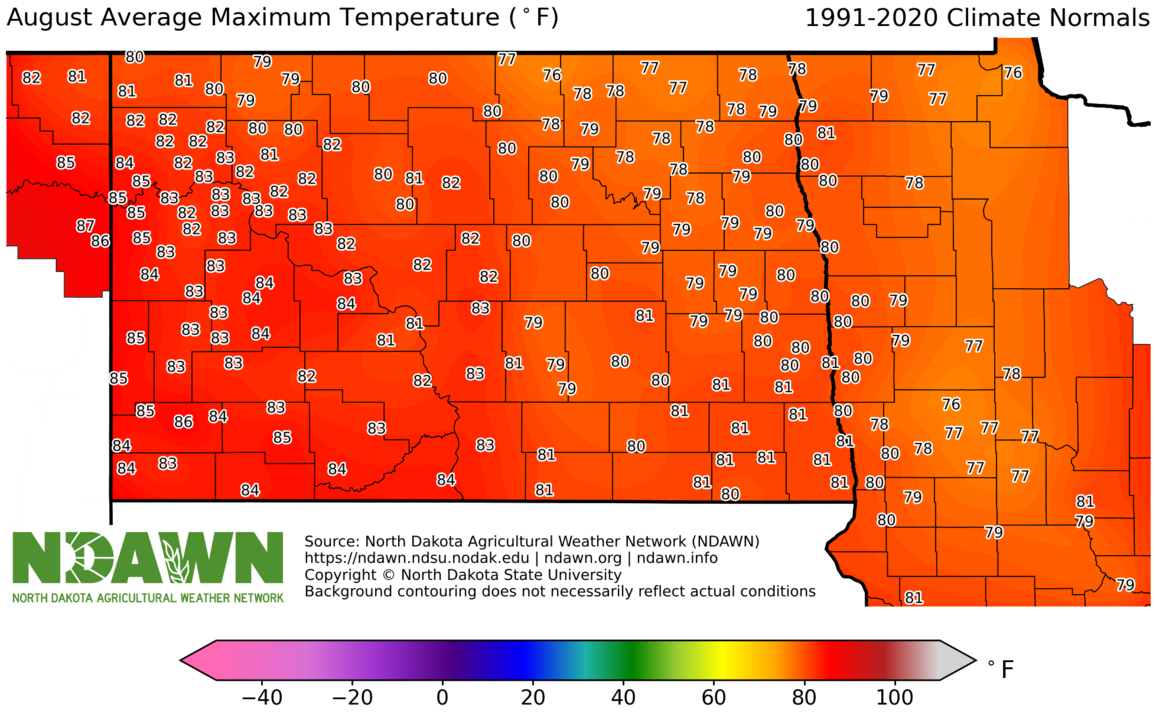 August average Maximum Temperature (°F) 1991-2020. Source: North Dakota Agricultural Weather Network (NDAWN). © Copyright North Dakota State University. Background contouring does not necessarily reflect actual conditions.