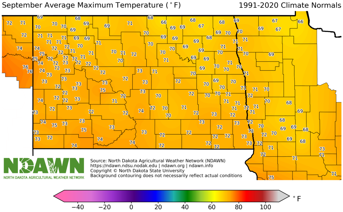 September Average Maximum Temperature (°F) 1991-2020. Source: North Dakota Agricultural Weather Network (NDAWN). © Copyright North Dakota State University. Background contouring does not necessarily reflect actual conditions.