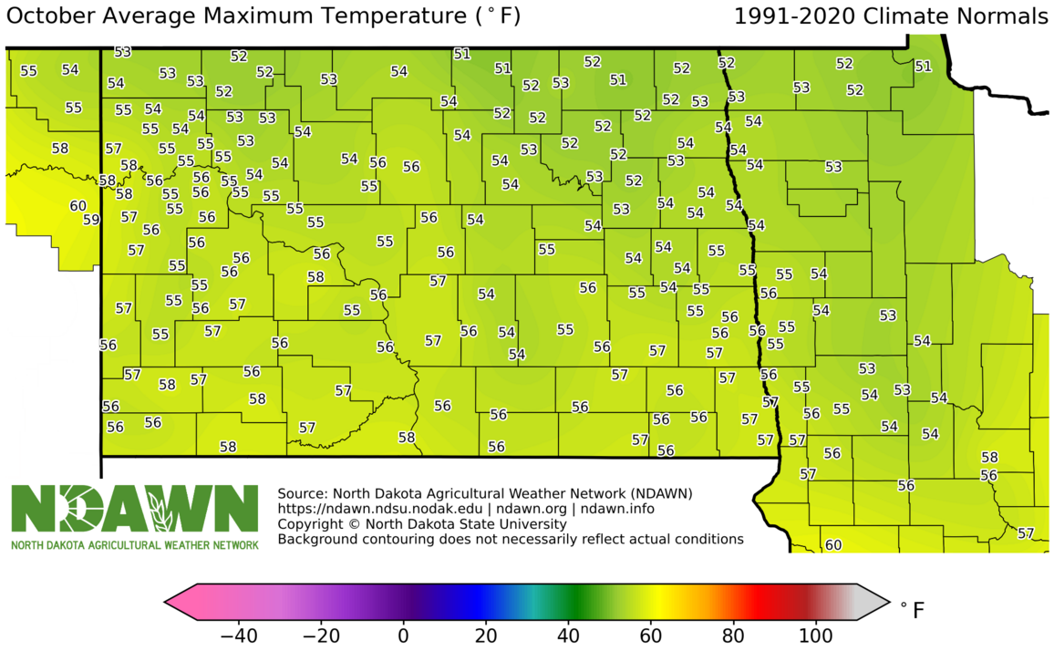 October Average Maximum Temperature (°F) 1991-2020. Source: North Dakota Agricultural Weather Network (NDAWN). © Copyright North Dakota State University. Background contouring does not necessarily reflect actual conditions.
