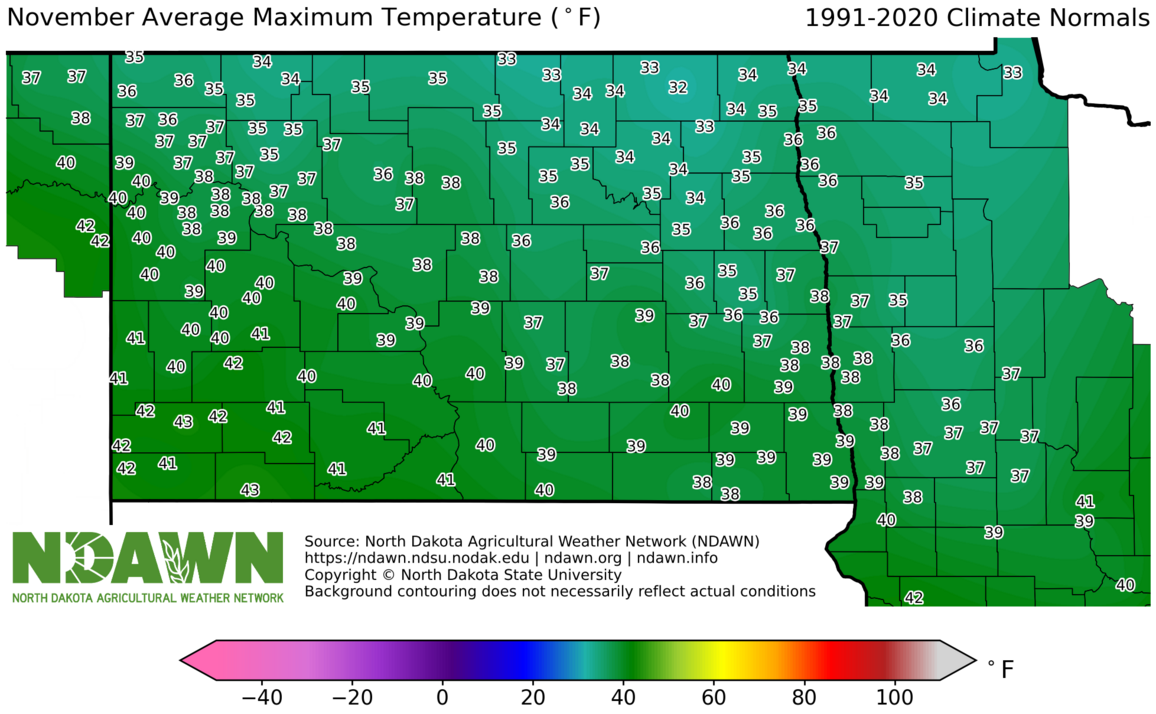 November Average Maximum Temperature (°F) 1991-2020. Source: North Dakota Agricultural Weather Network (NDAWN). © Copyright North Dakota State University. Background contouring does not necessarily reflect actual conditions.