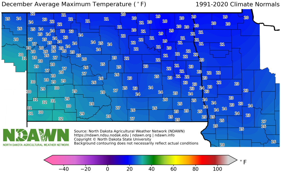 December Average Maximum Temperature (°F) 1991-2020. Source: North Dakota Agricultural Weather Network (NDAWN). © Copyright North Dakota State University. Background contouring does not necessarily reflect actual conditions.