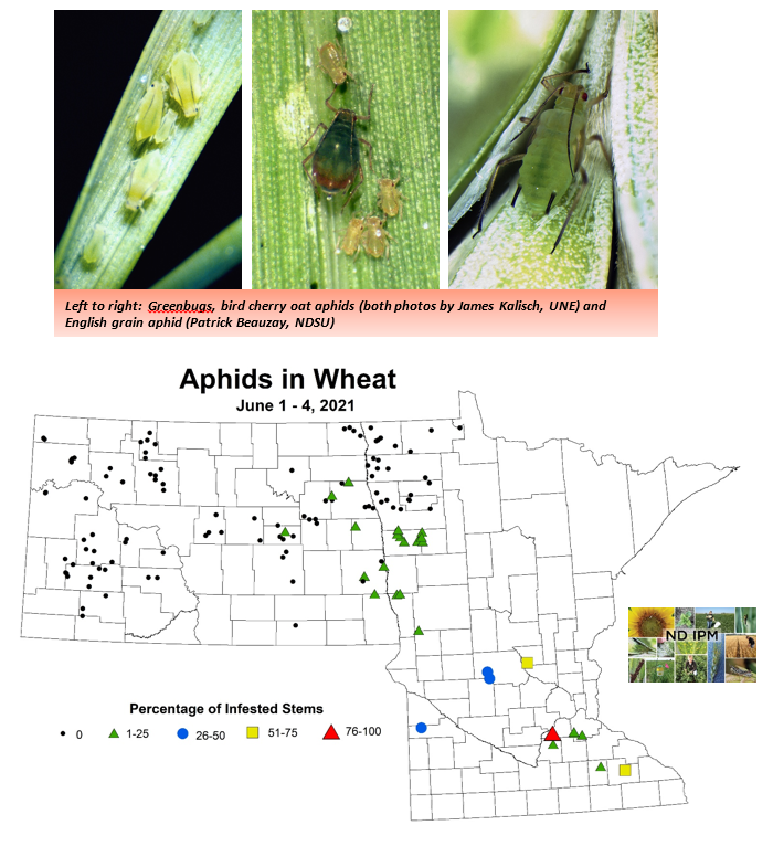 Scouting for cereal aphids is easy and should begin at stem elongation. Look on the undersides of leaves and near the base of the plant for the tiny ⅛-inch long, greenish and pear-shaped aphids. IPM scouts observed both winged and wingless aphids as well as a mother aphid with young. The most common species observed last week was the English grain aphids in ND wheat fields, but an IPM scout found bird cherry oat aphids in one wheat field of Minnesota (Source: Dr. Jochum Wiersma, UMN Extension). Bird cherry oat aphid is known for being the most effective vector of BYDV. Barley yellow dwarf can stunt plants and reduce yield. Symptoms of BYDV is a yellowing to reddish color near tips of leaves, often the flag leaf.