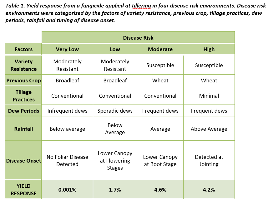 One of the most common questions pertaining to a fungicide at tillering pertains to yield response (or yield protection). First, remember the fungicide will only protect leaves made available at the time of application and will not provide season-long protection. Also, the observed yield response from an early-season fungicide application depends on several factors. These include the amount of disease resistance in the variety planted, environmental factors, and agronomic practices. Each year I update a data set that observes the yield trends from a fungicide application at tillering under diverse field environments. In table 1, I have summarized the data from 85 small plot trials and categorized them into four disease risk environments. Disease risk environments were determined using information pertaining to variety resistance, previous crop, tillage practices, dew periods, rainfall, and timing of disease onset. You will notice the yield response from an early-season fungicide (regardless of fungicide used) protects more yield under higher disease risks. For example, let’s assume we have a 55 bu/a wheat crop. In a very low disease environment, the yield response is less than 0.01 bu/A. However, in a moderate to high disease risk environment, the yield response would range from 2.3 to 2.5 bu/a.