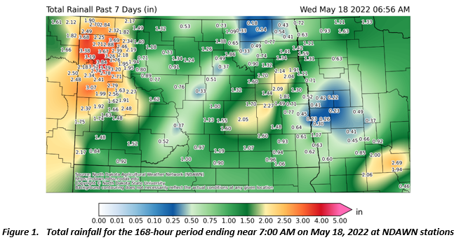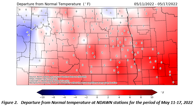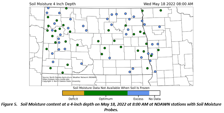 Almost one-half of NDAWN (North Dakota Agricultural Weather Network) stations now have soil moisture probes in place. These probes are placed at the standard depths of 2”, 4”, 8”, 20” and 40”. The NDAWN staff is scheduled to install soil moisture probes at an additional 25 stations this summer. No surprise that all stations have either excess or high optimal water in the top several inches of the soil. (Figure 5).