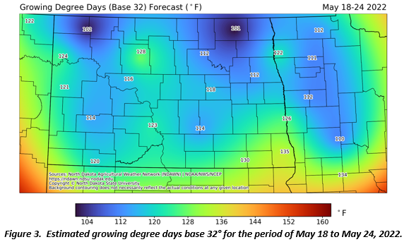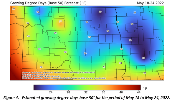 Figures 3 and 4 below are forecasted estimates of Growing Degree Days (GDDs) base 32° (wheat and small grains) and 50° (Corn and Soybeans). Because of the cooler temperatures moving into the area, very few GDDs are expected in this period and most of what is recorded will occur next week.