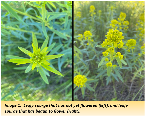 Leafy spurge flowers are inconspicuous, and it is actually the yellow bracts that are showy. Thus, to hit the optimal application timing, it is important to inspect the flower to ensure it is indeed a true flower and not just bracts. Below are two photos of leafy spurge taken at the same site in Fargo, ND on May 27th. The photo on the left is not yet a true flower, whereas the leafy spurge on the right has begun the true flower stage.