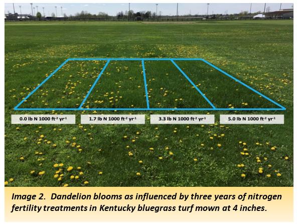 While writing about yellow flowers, I am compelled to discuss dandelions and share a tidbit of my previous research. During a turfgrass mowing height and nitrogen fertility experiment, I noticed that the experimental treatments likely influenced the prevalence of dandelions. When I counted the number of dandelions per plot, both mowing height and nitrogen fertility had treatments that were different from one another. After three years (and with no chemical control), plots mown at 3 and 4 inches had fewer dandelion plants than those mown at 2 inches. Additionally, plots receiving more than 3.3 lb N per 1000 ft2 per year had fewer dandelion plants than the non-fertilized check. As seen in the photo below, a decreasing number of dandelion blooms were observed as nitrogen fertility increased.