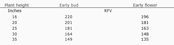 Plant height is the best indicator of when to take the first harvest (Table 1). Note that the relative feed value (RFV) (relative forage quality (RFQ) would produce a similar table) decreased from 220 to 149 as the plant height increased from 16 to 35 inches when all samples were taken at the early bud stage. A similar effect was seen at the early flower stage. Also note that the loss in RFV was much less when the maturity stage increased from early bud to early flower within a given height.