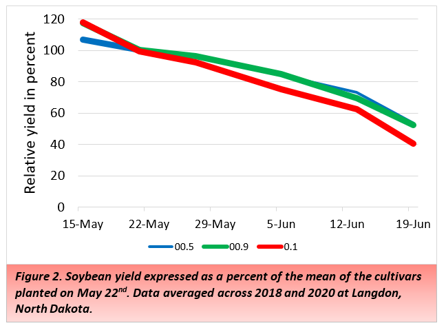 Figure 2 provides the relative yield of the three varieties and six planting dates averaged across two years, expressed in percent. The average yield for the three varieties for the May 22nd planting date was set at 100 percent and all other yields are expressed as a percent. Yields declined with later planting of soybean. The latest maturing cultivar (0.1) had the highest yield when planted early. After the May 22nd planting date, the late maturing cultivar yielded lower than earlier maturing cultivars.