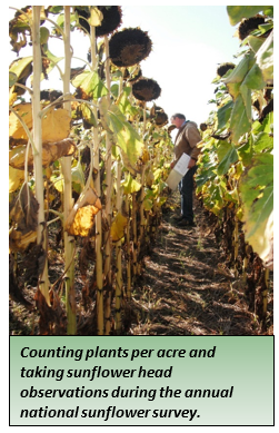 First, estimate the plant population from a number of locations within a field, away from the headlands. The number of plants per 20 feet of row can easily be established. With solid-seeded sunflower, getting a good population estimate is more difficult.