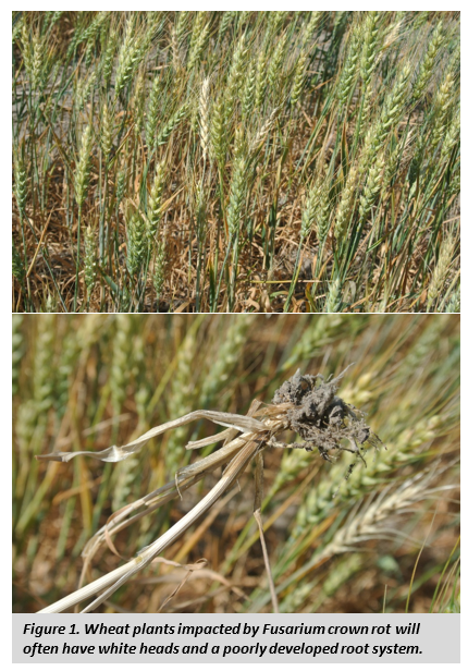 Root Rots: Some true fungal pathogens (such as Fusarium and Rhizoctonia) do not need much water to cause root rots. And when they occur in dry years, their impact on yield is often more severe because the crop is already water stressed. While some damage is evident shortly after emergence, much of the damage may not be noticeable until mid-way through the growing season. A good example is Fusarium Crown Rot of wheat. Although the pathogen infects early, it is not until after heading that you will see the damage on a water stressed plant (Figure 1). Alternately, fungal-like root rot pathogens (such as Phytophthora, Aphanomyces and Pythium), need lots of soil moisture to cause infection, and tend to be less severe in dry years. The exception to this rule are diseases that need sufficient moisture for only a short amount of time. For example, downy mildew of sunflower only needs wet soils after planting to cause systemic infection, that will result in plant death regardless of the environmental conditions.