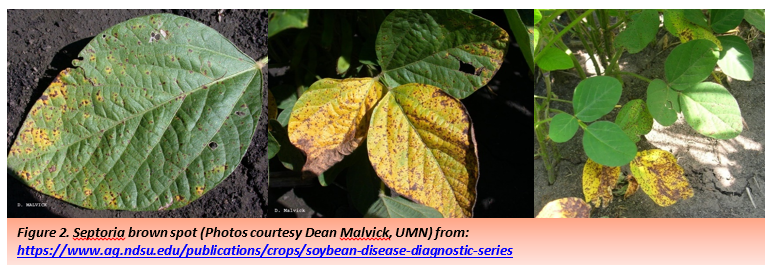 Leaf symptoms begin as small dark brown spots, that may or may not have a halo (Figure 2, left image). Brown spots may coalesce and infected leaves may turn yellow, creating leaves that appear golden with brown spots or patches (Figure 2, middle image). Symptoms are first found on the lower canopy and appear to work their way up the plant (Figure 2, right image). The disease is favored by warm and wet weather. We have had the warm, but not-so-much the wet. Yield loss from Septoria brown spot is thought to be rare in our region even in a favorable year, and particularly so if the disease doesn’t impact the upper canopy.