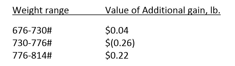 To calculate the value of additional gain, weights and prices for various sizes of cattle are needed. Table 1 uses North Dakota sale barn prices and corresponding weights reported February 9, 2017. https://www.ams.usda.gov/mnreports/sf_ls764.txt
