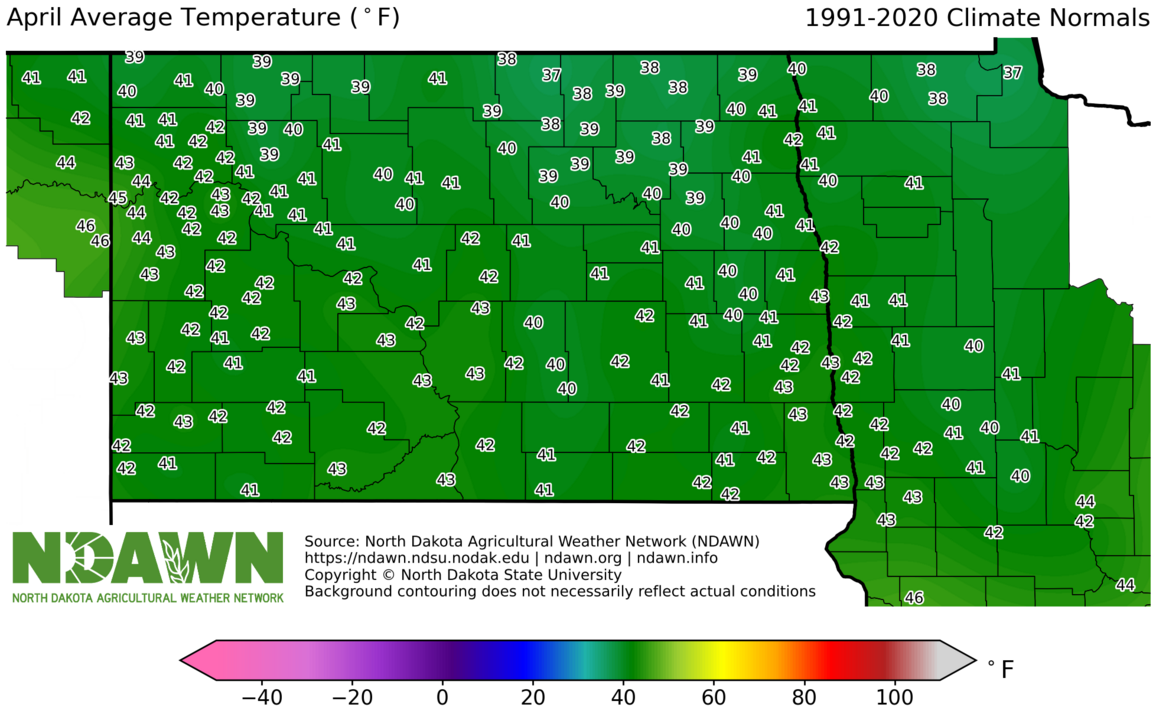 April Average Temperature (°F) 1991-2020. Source: North Dakota Agricultural Weather Network (NDAWN). © Copyright North Dakota State University. Background contouring does not necessarily reflect actual conditions.