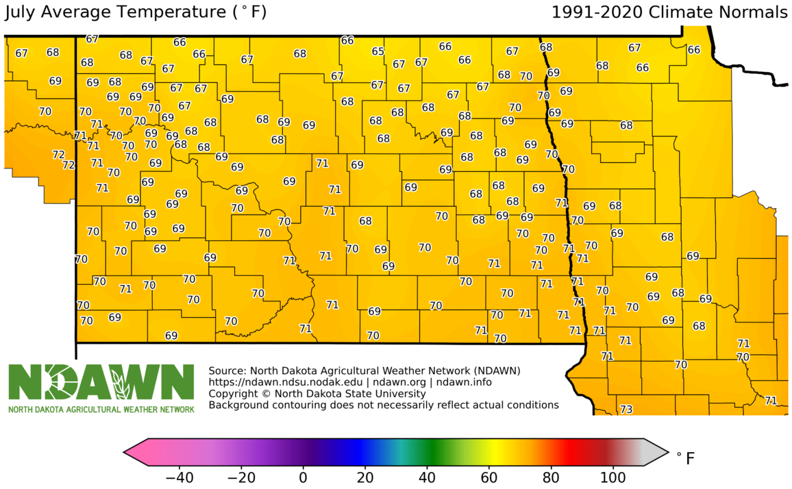 July Average Temperature (°F) 1991-2020. Source: North Dakota Agricultural Weather Network (NDAWN). © Copyright North Dakota State University. Background contouring does not necessarily reflect actual conditions.