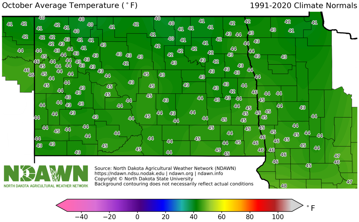 October Average Temperature (°F) 1991-2020. Source: North Dakota Agricultural Weather Network (NDAWN). © Copyright North Dakota State University. Background contouring does not necessarily reflect actual conditions.