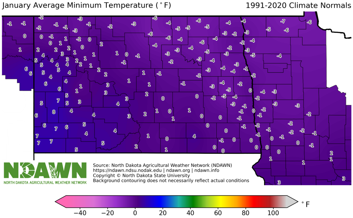 January Average Minimum Temperature (°F) 1991-2020. Source: North Dakota Agricultural Weather Network (NDAWN). © Copyright North Dakota State University. Background contouring does not necessarily reflect actual conditions.