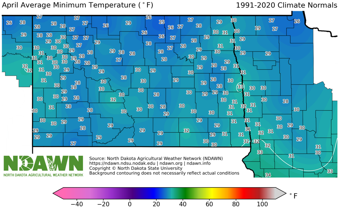 April Average Minimum Temperature (°F) 1991-2020. Source: North Dakota Agricultural Weather Network (NDAWN). © Copyright North Dakota State University. Background contouring does not necessarily reflect actual conditions.