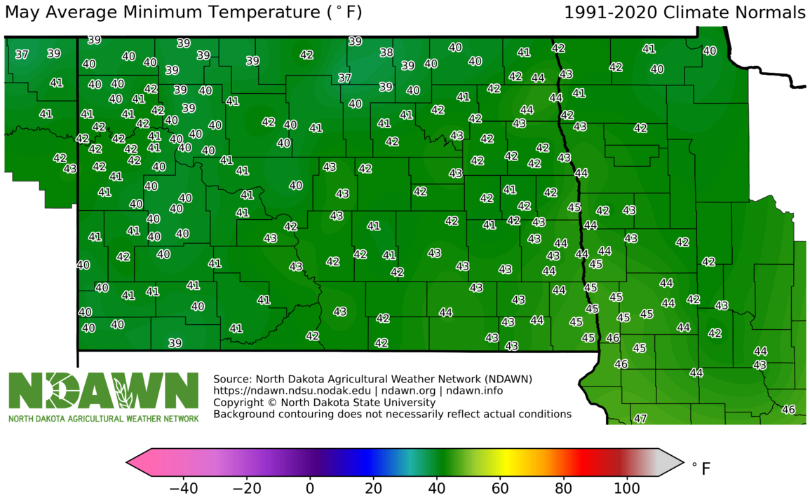 May Average Minimum Temperature (°F) 1991-2020. Source: North Dakota Agricultural Weather Network (NDAWN). © Copyright North Dakota State University. Background contouring does not necessarily reflect actual conditions.