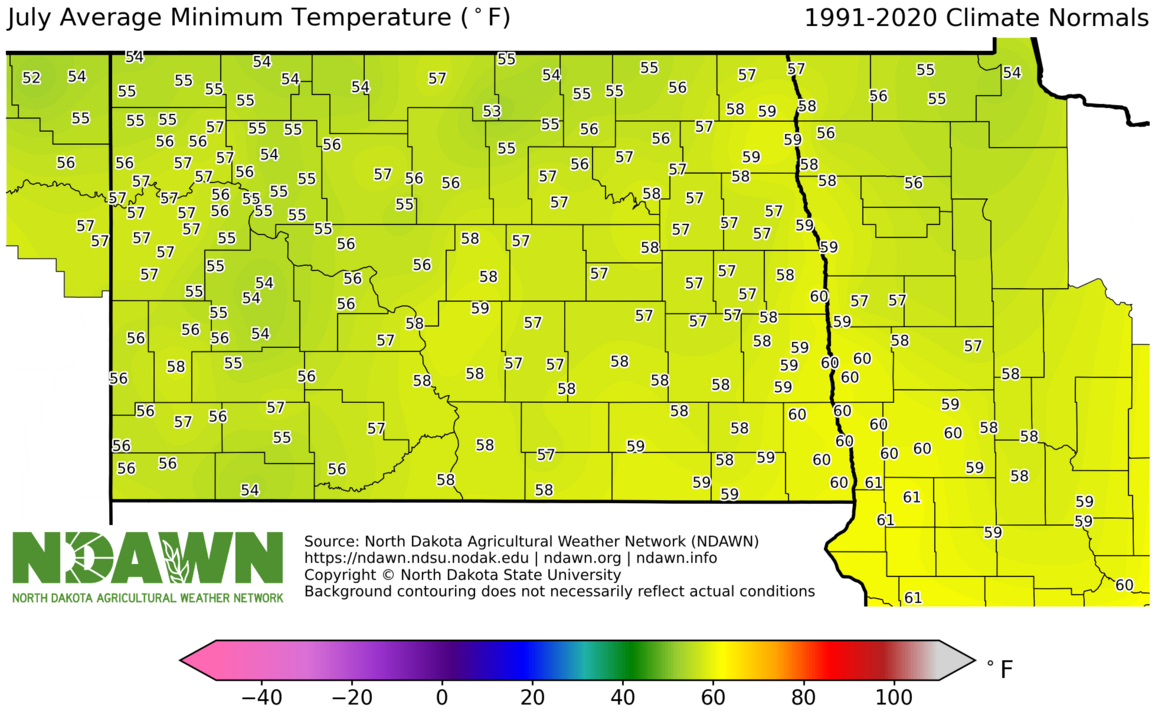 July Average Minimum Temperature (°F) 1991-2020. Source: North Dakota Agricultural Weather Network (NDAWN). © Copyright North Dakota State University. Background contouring does not necessarily reflect actual conditions.