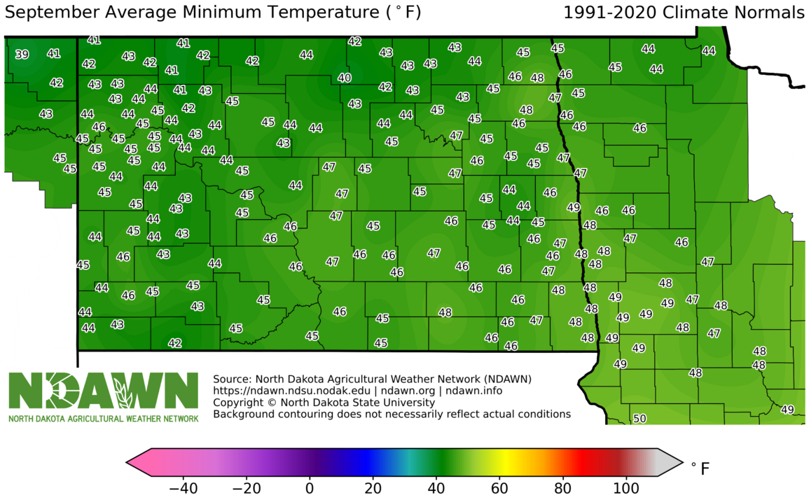 September Average Minimum Temperature (°F) 1991-2020. Source: North Dakota Agricultural Weather Network (NDAWN). © Copyright North Dakota State University. Background contouring does not necessarily reflect actual conditions.