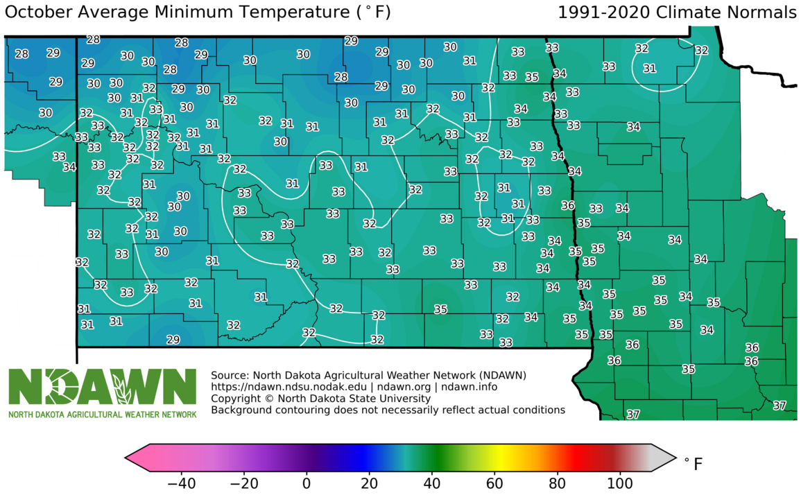 October Average Minimum Temperature (°F) 1991-2020. Source: North Dakota Agricultural Weather Network (NDAWN). © Copyright North Dakota State University. Background contouring does not necessarily reflect actual conditions.