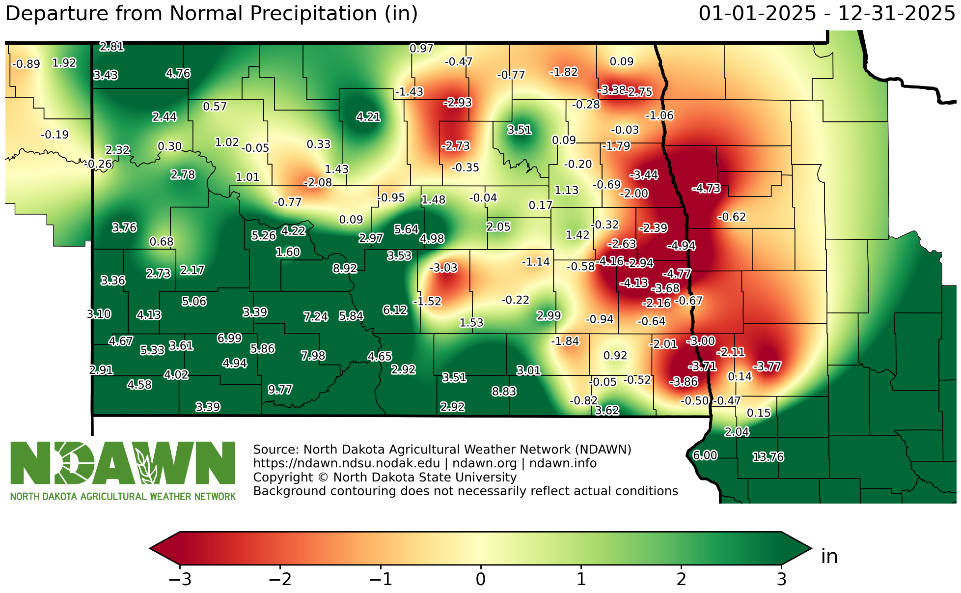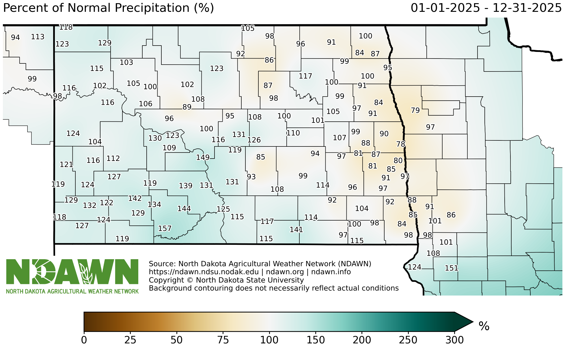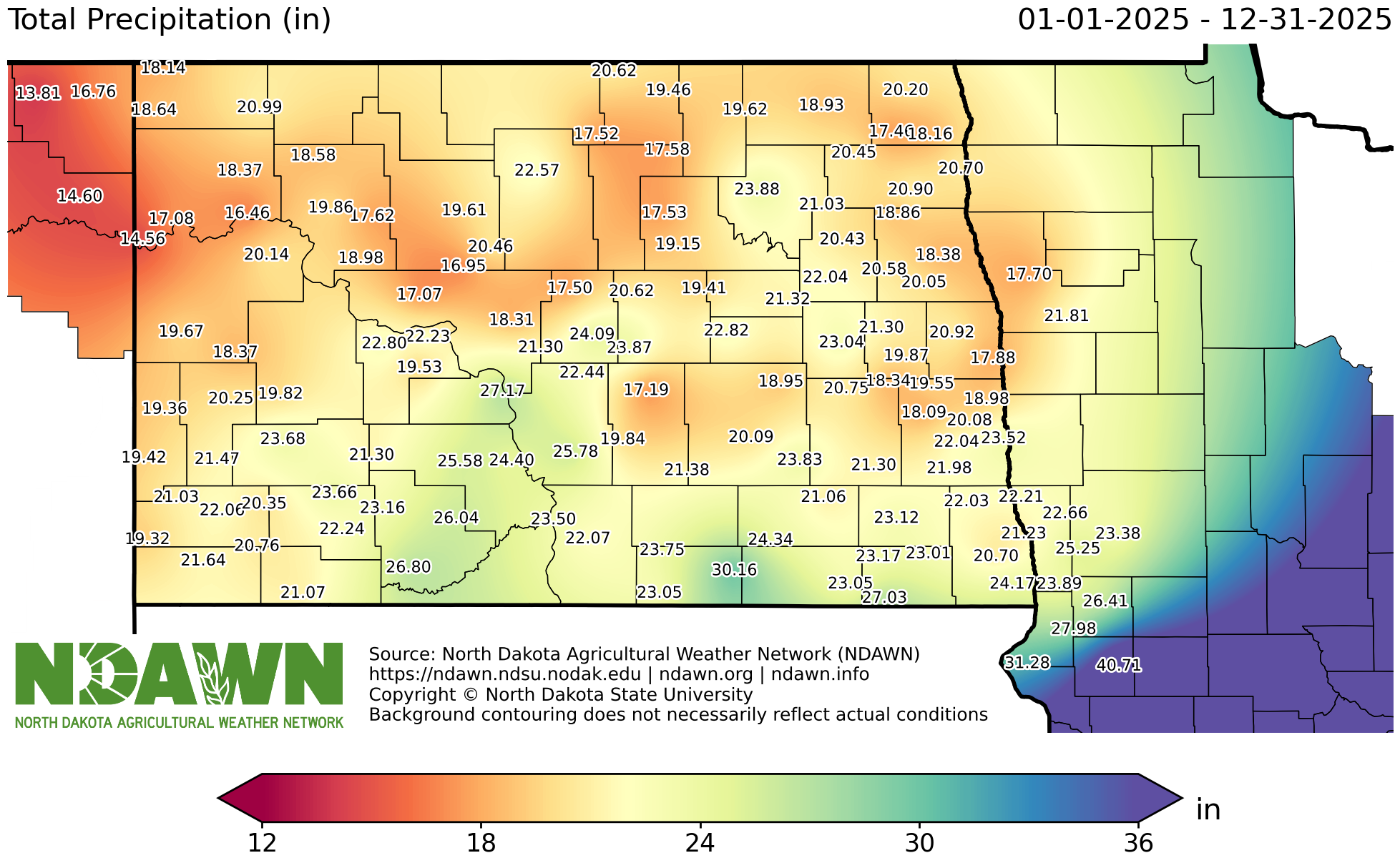 Breadcrumb Ag Home Ag Hub Ag Topics North Dakota State Climate Office Climate Data Precipitation Page Title Precipitation Text Annual Statistics for Total Precipitation, Percent of Normal Precipitation, and Departure from Normal Precipitation are presented Sections Total Precipitation2025Statewide Average Annual Total Precipitation: 20.87"20242023 Percent of Normal Precipitation2025Statewide Percent of Normal Annual Precipitation: 106%20242023 Departure from Normal Precipitation2025Statewide Departure from Normal Annual Precipitation: +1.14"20242023 Monthly and Seasonal Statistics Archive Connect Ag Hub Topics Ag Topics North Dakota State Climate Office Contact NDAWN Current Conditions Climate Data Historical Daily Weather Bismarck Fargo Grand Forks Williston Climate Normals High Temperature Low Temperature Average Temperature Precipitation Spring Frost Fall Frost Air Temperature Precipitation Wind ENSO Energy Climate Summaries Outlook Crop Production Crop & Pest Report Subscribe Variety Trials Tools Crops Soybeans In the Pod Soybean Updates Iron Deficiency Chlorosis in Soybean Late Planting Soybean Nitrogen and Soybean Nodulation Results of Foliar Fertilizer Application in Soybean Soybean Aphid - Overwintering Mortality Corn Estimating Corn Grain Yield Seed Corn Maggot Wheat How Heat and Water Stress Effects Wheat Plants in Vegetative Stages Alfalfa Time of Seeding for New Alfalfa Establishment Canola Canola Straight Cut or Swath Scouting for and Treating Canola Flea Beetle Barley Estimating Yield Weed Control Guide Durum Wheat and Barley Control Moisture with Natural Air Drying Scouting for Ergot Drying Wheat or Barley with Heat Grain Stream Sampling and Sampler Construction Small Grain Damage from Frost Dependent on Many Factors Chickpea Dry Edible Bean Harvest Tips for Frozen Dry Edible Beans Field Pea Flax Forages Forage Quality of Oat Hay Forage Quality of Barley Hay - Fargo Forage Quality of Barley Hay - Carrington Cool Season Forages for Hay Forage Brassicas for Grazing Sorghum as Silage 2012 Sorghum as Silage 2013 Watch for Poisonous Blister Beetles When Cutting Hay Hemp Seed Lentils Oats Oat Production in North Dakota Potatoes Safflower Sugarbeets Best Management Practices for Highest Returns in Late Planted Sugarbeet Boron/Calcium Deficiency in Drought-Stressed Sugar Beets Cercospora Leaf Spot in Sugarbeet Common Ragweed in Sugarbeet Managing of Rhizoctonia Damping-Off, Crown Rot and Root Rot of Sugarbeet Monitoring and Controlling Sugarbeet Root Maggot Sugarbeet Report What should I do if I have Waterhemp Escapes in Sugarbeet? Sunflowers Other Crops Sorghum Grain Soil Health Aggregation & Erosion Soil Erosion Soil Crusting Soil Compaction Aggregates are a part of soil structure and function Tips for Handling Flooded Soils Groundwater and Soils Soil Water Movements; Gravitational Movement and Capillary Rise Video Water Management Suggestions to Improve Soil Health ND On-Farm Research Network Soil Fertility Considerations for Use of Enhanced Efficiency Nitrogen Fertilizers Guidelines for Fall N Application in North Dakota Late Wet Spring Soil/Fertilizer Considerations Soil Testing The Cost of Soil Erosion The Relationship of Between Crop Production and Sustainability Soil Biology Saline and Sodic Soils Soil Salinity Soil Sodicity Soil Salinity and Sodicity Challenges Soil Sodicity and Its Management What Should We Do First On Sodic Soils? Organic Matter & Soil The Fertilizer Value of Wheat Straw Cover Crops How to Select a Cover Crop Wide-Row Corn with Cover Crops Broadleaf Crops 2016 Cover Crops Report Cover Crop Seeds and Pictures Winter Rye as a Preceding Cover Crop for Dry Bean Cover Crop Webinar Series Prevent Plant Options Selecting a Cover Crop Benefits of Adding Cover Crops to Your Rotation Nitrogen Credit from Cover Crops Cover Crop and Residual Herbicide Information Cover Crops for Wet Field Conditions Irrigation & Tile Drainage Agricultural Drainage Irrigation in North Dakota Chemigation Irrigation Scheduling Irrigation - Frequently Asked Questions Subsurface Water Management Impact of Flooding / Waterlogging on Crop Development Diseases, Insects and Weeds Integrated Pest Management Barley Canola Insect Traps Corn Grasshoppers Soybeans Sunflower Sunflower Insect Traps Wheat Wheat Insect Traps Crop Diseases Abiotic (Non-Infectious) Symptoms in Wheat Brown Stem Rot of Soybeans (BSR) Charcoal Rot of Soybeans Distinguishing Soybean Leaf Diseases Expected Yield Loss from Goss’s Wilt Fungicide Application on Soybean Scouting for Corn Stalk Rot Sudden Death Syndrome (SDS) of Soybeans White Mold: Summary of Risk Factors How to Sample for Soybean Cyst Nematode (SCN) Leaf Discolorations in Corn (08/13/20) Scouting for Clubroot of Canola (08/06/20) Review of Sunflower Rust (07/30/20) Scouting for Dry Edible Bean Rust Small Grain Diseases: Management of Those More Common and Severe in Dry Years Diseases in Drought Years (07/02/20) Insects Clean Up Grain Bins to Reduce Insect Pests Weeds CDMS Label Search Early Season Weed ID Samples: The Good, the Bad, and the Ugly ND Herbicide / Weed Surveys ND Weed Control Research Scout for and Create Weed Maps Weed Control Guidline Wild World of Weeds Pesticides Tank Cleanout Procedures (06/18/20) Fumigation Resources Dicamba: Considerations for Dicamba Alternatives (06/11/20) Flooded Pesticides Chlorpyrifos Update (Summer 2022) Which Insecticide is Best for Grasshopper Control? Drying & Storage Corn & Soybeans Wheat and Barley Fans and Energy Efficiency Storage Sunflower, Dry Bean and Canola Events Livestock Tools Alternative Cow Replacement Backgrounding 550 lb Steers CalfWeb/Cattle Feeding Breakeven Budget CalfWeb/Cattle Feeding Closeout Calculator Cow Herd Budget Tool Estimating Winter Cattle Forage Needs LFP Calculator Projected Fall Cow-Calf Budget Summer Grazing Budget Beef BQA & Health Necropsy – Determining Why a Calf Died What is Beef Quality Assurance BQA Checklist BQA Post Test BQA Pre Test BQA Records Transfer Form Certifica