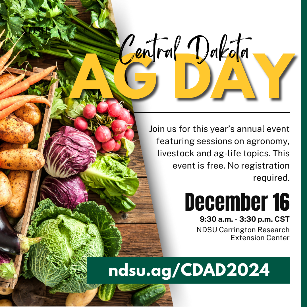 For more information about Central Dakota Ag Day visit: ndsu.ag/CDAD2024. Direct questions or request accommodations to Jeff Gale at 701-652-2581 or by email at jeff.gale@ndsu.edu.