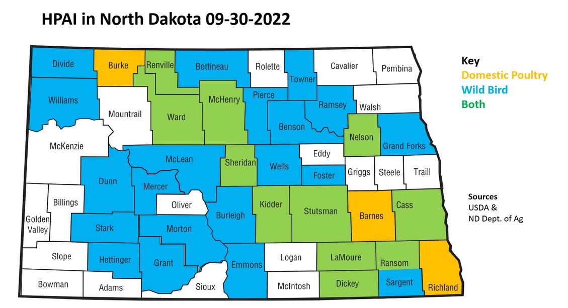 Instances of HPAI decreased during the summer months, but with the fall migration beginning a resurgence has occurred. You can find information on the current cases of HPAI in North Dakota as well as the poultry/bird event restrictions map on the North Dakota Department of Agriculture website: https://www.nd.gov/ndda/hpai.