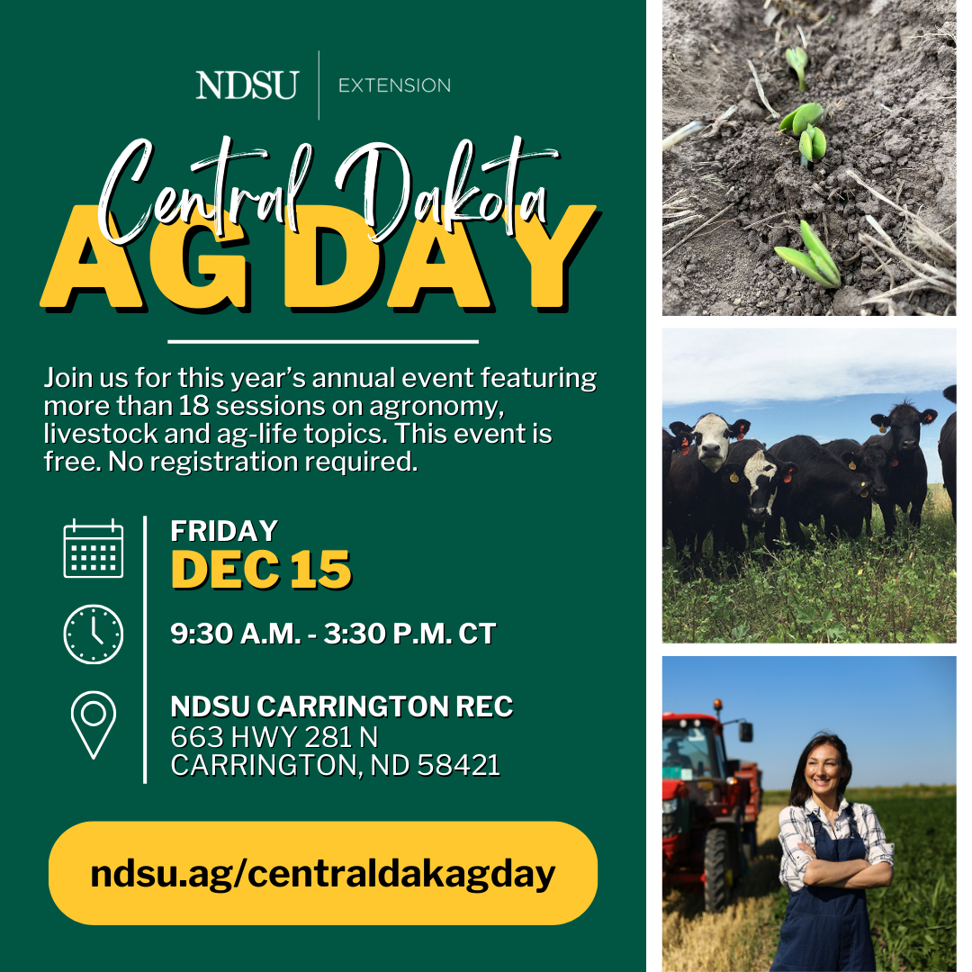 We invite you to attend Central Dakota Ag Day, Friday, December 15, 2023 at the Carrington REC. Foster County Extension Agriculture and Natural Resources Agent Jeff Gale is organizing this full day with two keynote speakers and 18 concurrent sessions. The full schedule and many details are available online, but here are highlights: