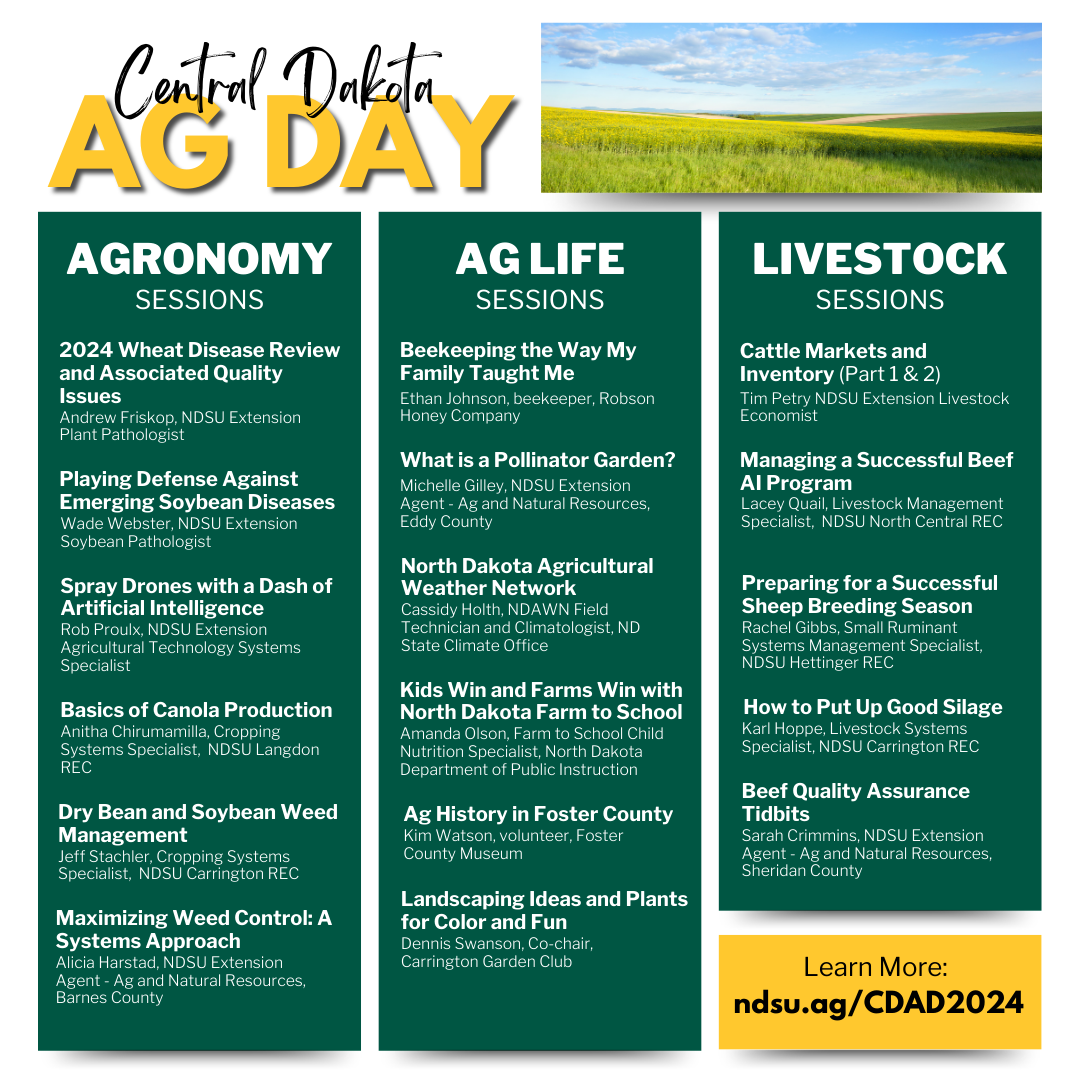 A multi-county Extension team from Foster, Barnes, Eddy, Griggs, Sheridan, Stutsman, and Wells counties, and the Carrington Research Extension Center, develops the Central Dakota Ag Day program each year. This year’s Central Dakota Ag Day will be held on Monday, December 16, at the NDSU Carrington REC. The full program begins at 9:30 a.m. with coffee and donuts. A sponsored lunch will be served. There is no registration fee, and preregistration is not required.