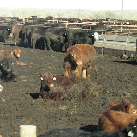 Energetically speaking, mud increases a beef animal’s effort needed to move and therefore reduces feedlot rate of gain. Mud reduces the insulating ability of the hair by creating tags. Mud can also reduce the desire of the beef animal to wander to a feed bunk and eat. Average daily gain is driven by feed intake. Reduced intake will depress average daily gain and will require more feed per pound of body gain.