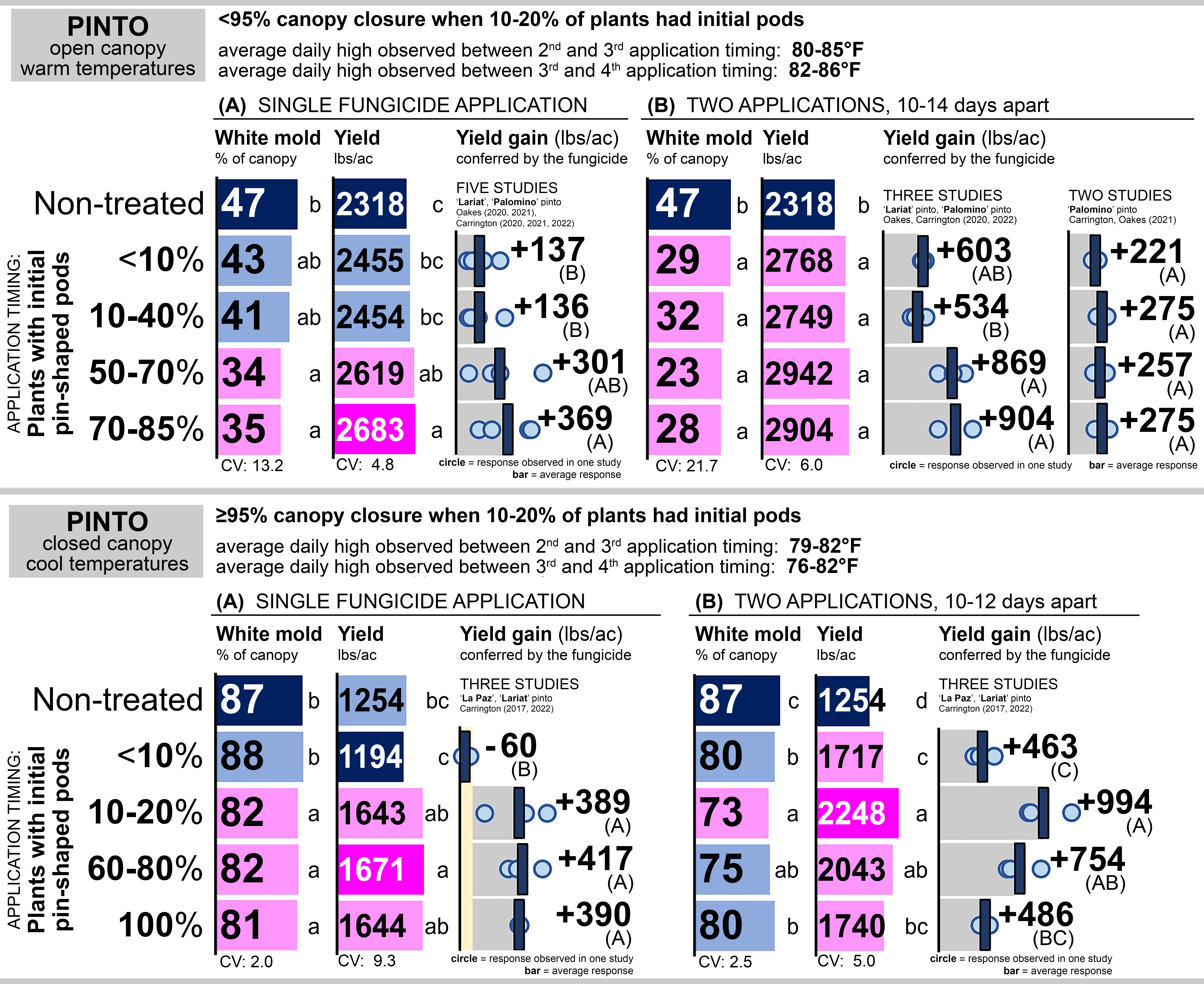 Fungicide application timing research conducted in Carrington and Oakes from 2017-2022 on pinto, black, and navy beans indicates that when conditions favor white mold as dry beans enter bloom, fungicide applications should be calibrated relative to the percent of plants with initial pin-shaped pods and daytime high temperatures.