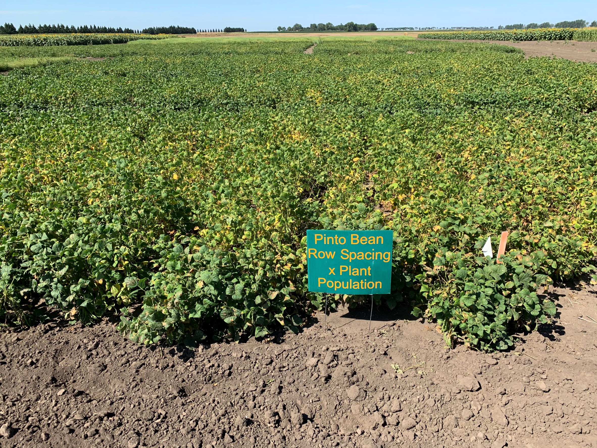 Recent NDSU production management research with pinto bean has included examining the interaction of increased plant population and reduced row spacing on yield compared the historical practice of establishing 70,000 plants per acre with 30-inch rows. North Dakota data from a 2021 dry bean grower survey (Knodel et al. 2022) indicate 55% of pinto bean were planted in row widths ranging from 11 to 25 inches compared to 40% grown in wide rows. In addition, the survey of North Dakota bean growers indicates 53% of pinto bean were planted at rates of 80,000 to 99,000 seeds per acre, with the likely goal of establishing greater than 70,000 plants per acre. During 2018-21, the Carrington and Langdon Research Extension Centers (REC), with financial support from Northarvest Bean Growers Association, conducted a field study comparing intermediate (18- or 21-inch) to wide (28- or 30-inch) row spacing plus targeted early-season plant stands of 50,000, 70,000 and 90,000 plants per acre.