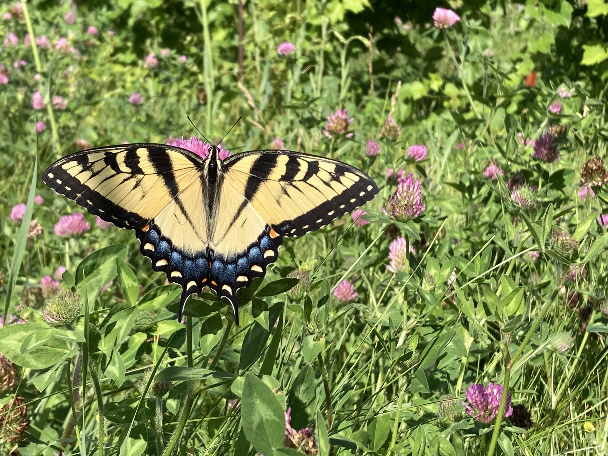 I’ve been managing the clover in and near the CREC orchard - letting it start blooming at different times, and there is a plethora of blooms this year. The big, yellow, Eastern (or Canada) Swallowtail butterflies and orange Monarch butterflies are nectaring in the clover all day. And now there are cabbage, painted lady, red admiral and other butterflies as well. There are just a few black swallowtail butterflies, as well.
