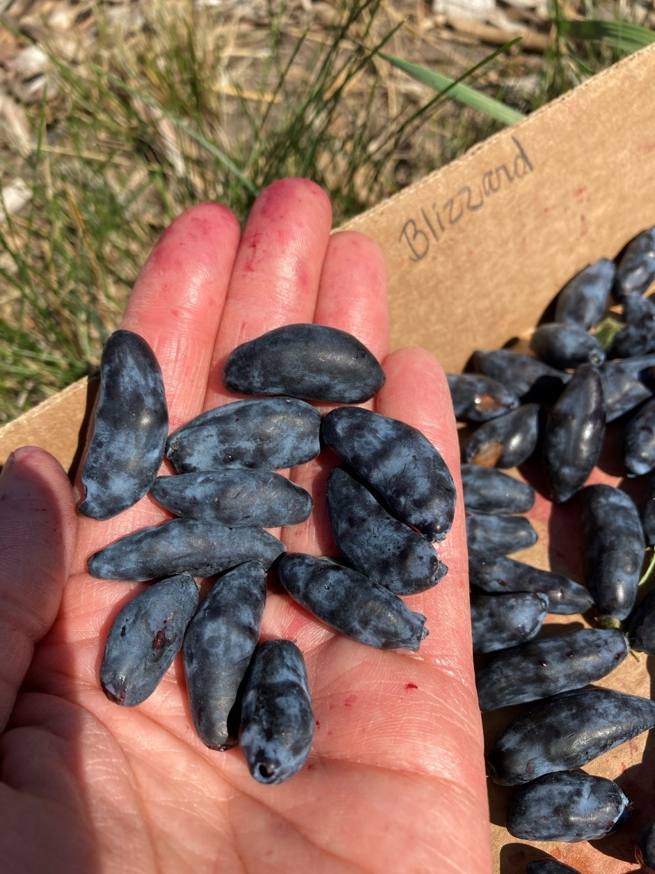 The early releases grow and flower really well at CREC but we have never had big crops from them. Of this group, Indigo Gem has the best production due to being partly self-fertile. In a survey I did with people who bought plants through a collaboration with Tongue River Winery and the North Dakota Grape and Wine Association, only a few people indicated that they had acceptable crops. Over 80% indicated that their crops were too small to support commercialization. This is similar to anecdotal conversations I have had from many locations: that a few people have great crops while others have been disappointed by production. I am not sure why it’s been difficult here. We have many genetically different plants for pollinization and the weather is often fine. There are not many wild bees though and the commercial honeybees often arrive too late for haskaps. Yet the Russian plants, which bloom the earliest, often have better yields.