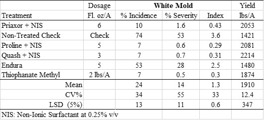 Langdon received above average rainfall during the growing season. The results indicate there were significant differences obtained among the variables tested when compared with the non-treated check. The fungicide Quash, followed by Proline and Priaxor gave the highest yields. Whereas, Thiophanate-Methyl had the lowest white mold incidence, severity and index.