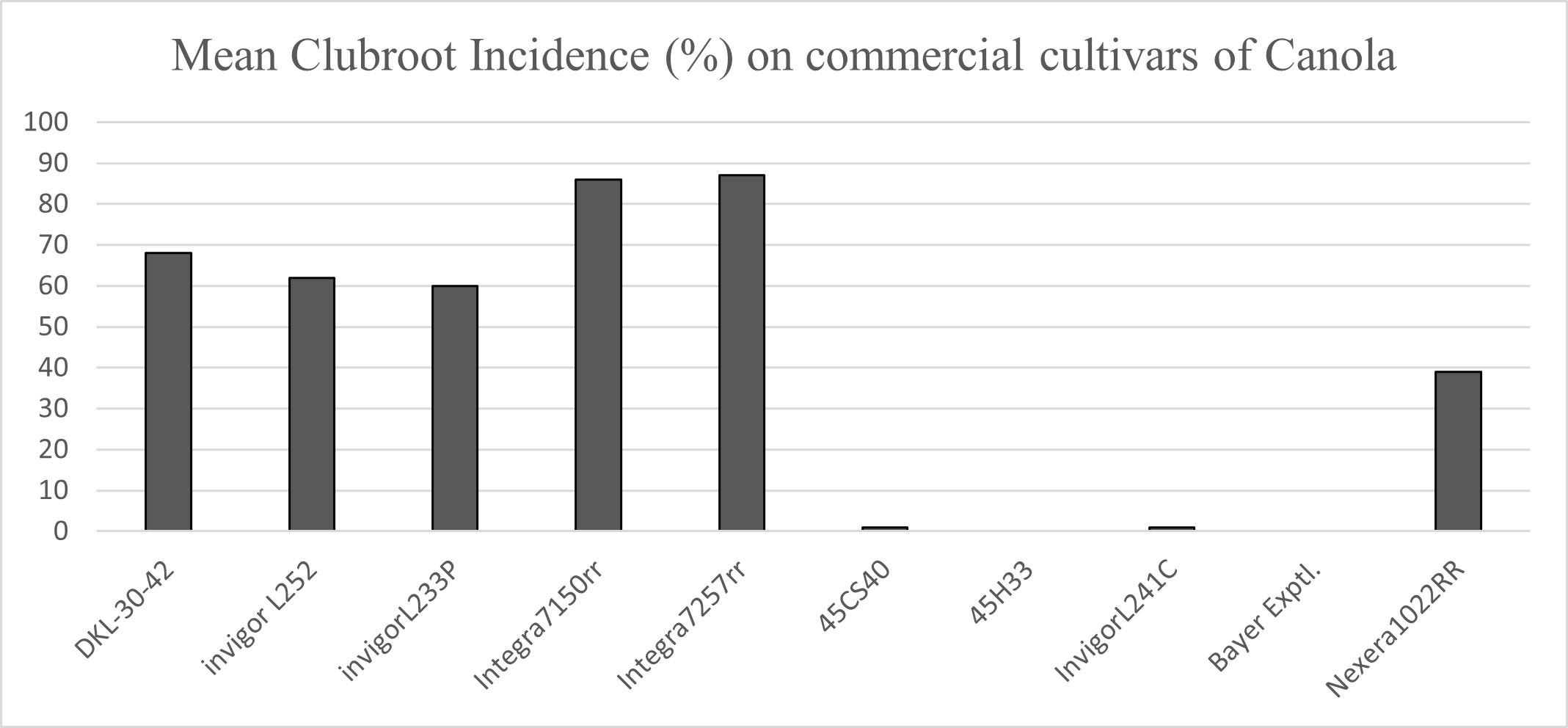 Figure 6: Mean clubroot incidence (%) on various commercially available cultivars of canola.