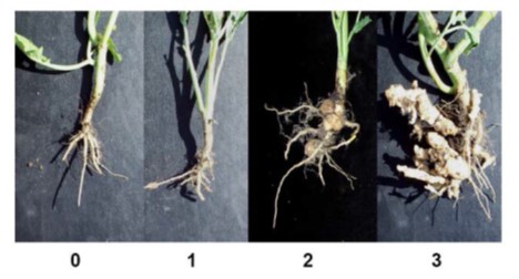 Clubroot rating scale: 0 = no galling; 1 = a few small galls (small galls on less than 1/3 of roots), 2 = moderate galling (small to medium-sized galls on 1/3 to 2/3 of roots), 3 = severe galling (medium to large-sized galls on more than 2/3 of roots) (S.E. Strelkov).