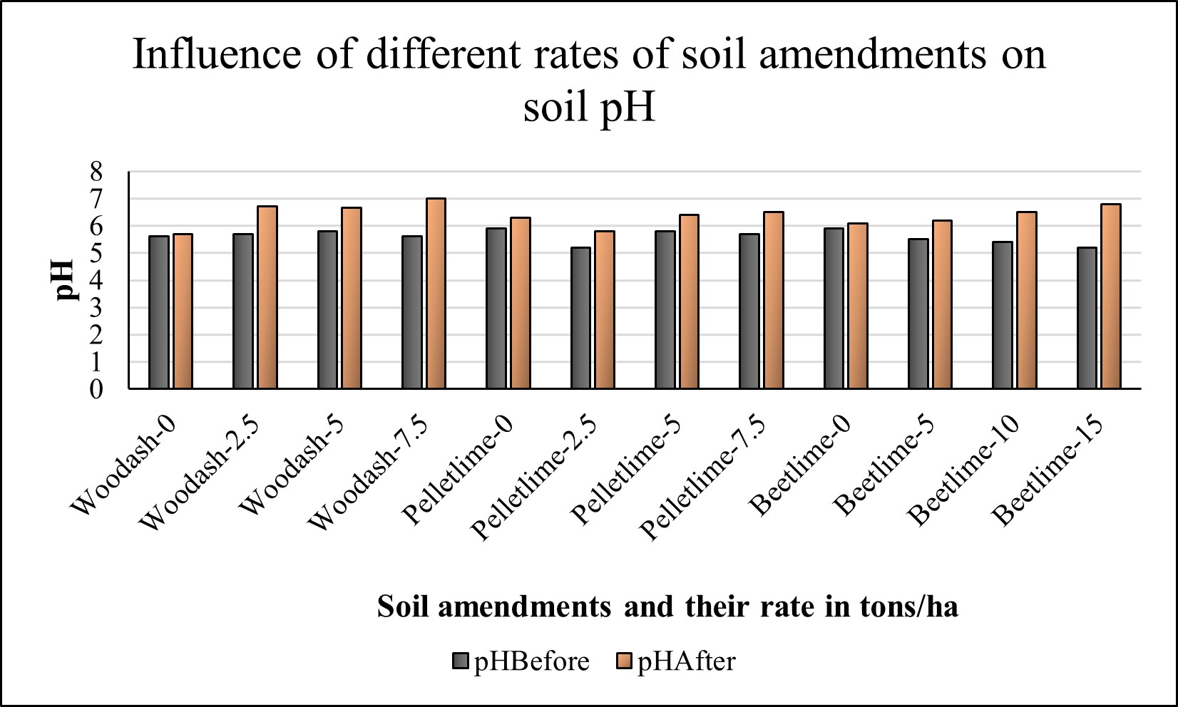 Method: Soil amendments of beet lime, pellet lime, and wood ash were evaluated. Three doses of 15, 10, and 7.5 tons/ha for beet lime. Pellet lime and wood ash were tested at 7.5, 5 and 2.5 tons/ha. Soil amendments were arranged as whole plot treatments, and doses/rates were sub-plots arranged in factorial randomized complete block design and replicated 4 times. Whereas, the non-treated check did not receive any treatment and was fine tilled as the other treatments. All three doses of each treatment of wood ash, pellet lime, and beet lime were applied seven days before planting into a soil depth of four inches and were thoroughly mixed in the soil with a rototiller.