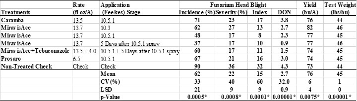 Fungicide treatments: Fungicides were applied with a CO2-pressurized backpack sprayer with a three-nozzle boom (XR-8002) and the water volume used was 20 GPA. Fungicide (Miravis Ace) application was made at half head emergence on July 2nd. Miravis Ace, Prosaro and Caramba were applied at full head emergence stage on July 5th and repeated 5 days after the full head emergence (July 9th) as per the protocol requirements. Refer to Table 2 for the treatments, dosages and application timings.