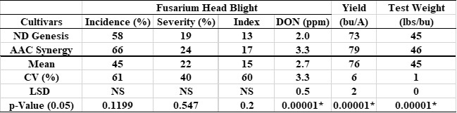 Cultivars of barley tested: ND Genesis (moderately susceptible/susceptible, released by NDSU) and AAC Synergy (moderately resistant, Syngenta)